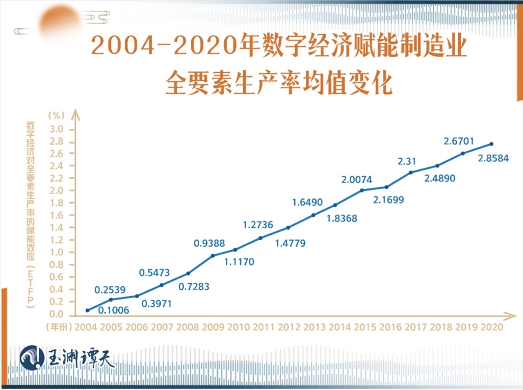 有學(xué)者做過測算,從2004年開始到2021年,數(shù)字經(jīng)濟(jì)賦能制造業(yè)全要素生產(chǎn)率效能呈逐年上升的趨勢,且近年來,賦能均值達(dá)到了最高點。