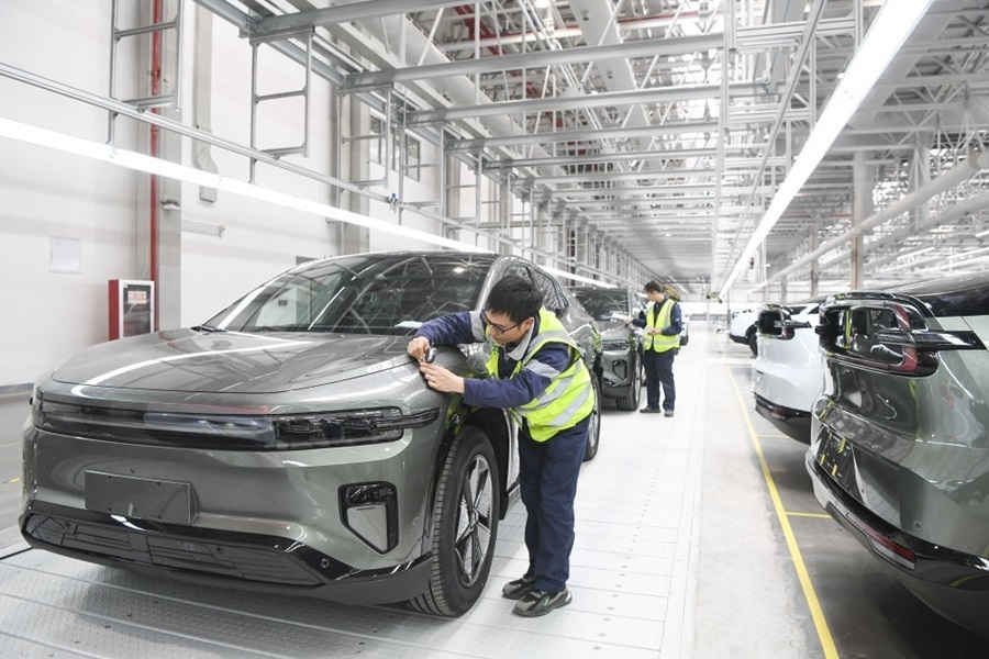 2024年3月14日,工作人員在長安汽車重慶渝北新工廠總裝車間進行整車下線前的檢查。新華社記者 王全超 攝