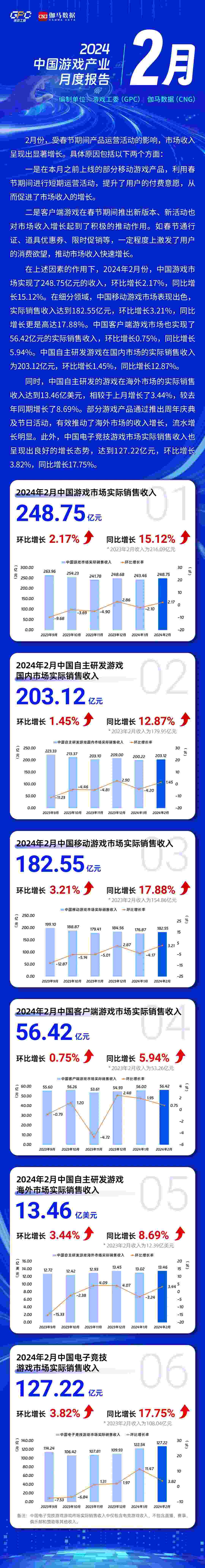 央視網(wǎng)消息:3月20日,據(jù)中國音數(shù)協(xié)游戲工委官微消息,2024年2月中國游戲產(chǎn)業(yè)月度報(bào)告發(fā)布。報(bào)告顯示,2024年2月份,中國游戲市場(chǎng)實(shí)現(xiàn)了248.75億元的收入,環(huán)比增長(zhǎng)2.17%,同比增長(zhǎng)15.12%。在細(xì)分領(lǐng)域,中國移動(dòng)游戲市場(chǎng)表現(xiàn)出色,實(shí)際銷售收入達(dá)到182.55億元,環(huán)比增長(zhǎng)3.21%,同比增長(zhǎng)更是高達(dá)17.88%。中國客戶端游戲市場(chǎng)也實(shí)現(xiàn)了56.42億元的實(shí)際銷售收入,環(huán)比增長(zhǎng)0.75%,同比增長(zhǎng)5.94%。中國自主研發(fā)游戲在國內(nèi)市場(chǎng)的實(shí)際銷售收入為203.12億元,環(huán)比增長(zhǎng)1.45%,同比增長(zhǎng)12.87%。
