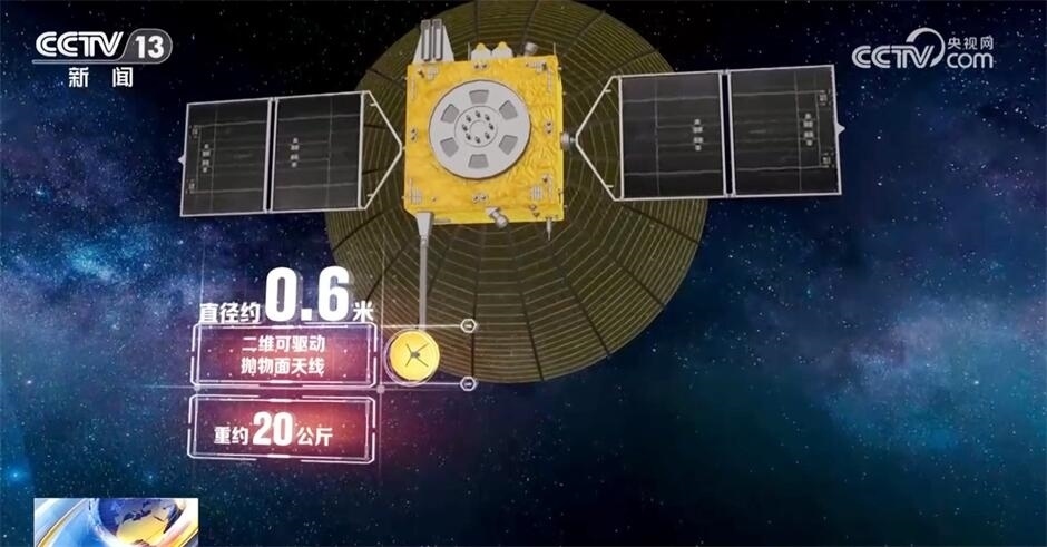 而在鵲橋二號中繼星上還有一個“小傘”,叫二維可驅動拋物面天線。它的直徑和重量都很小,直徑大約只有0.6米、重約20公斤。在太空中,通過兩軸驅動機構,保證每時每刻都能指向地面數據接收站。