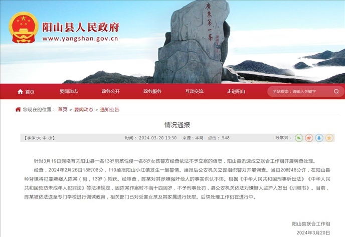 ·官方通報“13歲男孩性侵8歲女童警方不立案”:涉事男孩已被送至專門學(xué)校進(jìn)行訓(xùn)誡教育。