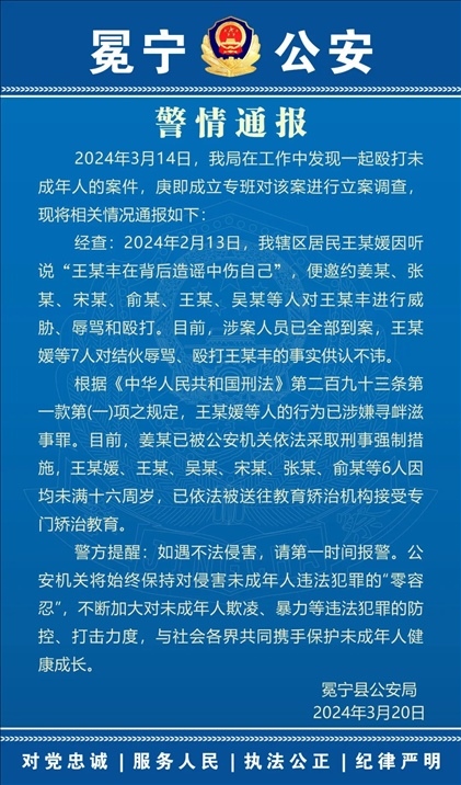 ·四川警方通報14歲女孩糾集多人圍毆男孩:1人被采取刑事強(qiáng)制措施,6人被送往教育矯治機(jī)構(gòu)。