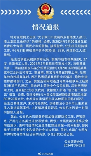 ·天津警方通報(bào)網(wǎng)傳“女子家門口發(fā)現(xiàn)三角標(biāo)記”。