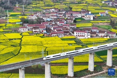 眼下,陜西漢中市百萬(wàn)畝油菜花競(jìng)相綻放,西成高鐵線上,一趟趟列車穿行在金黃色的油菜花海之中,為秦巴山區(qū)勾畫出朝氣蓬勃的春日景象。