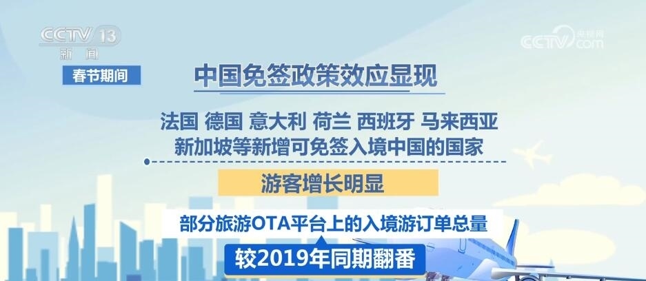 根據(jù)國家移民局統(tǒng)計(jì)數(shù)據(jù),2024年1月至2月,外籍人員入出境共計(jì)294.5萬人次,環(huán)比增長2.3倍,恢復(fù)至疫情前的41.5%。春節(jié)期間,中國免簽政策效應(yīng)顯現(xiàn),法國、德國、意大利、荷蘭、西班牙、馬來西亞、新加坡等新增可免簽入境中國的國家,游客增長明顯,部分旅游OTA平臺上的入境游訂單總量較2019年同期翻番。