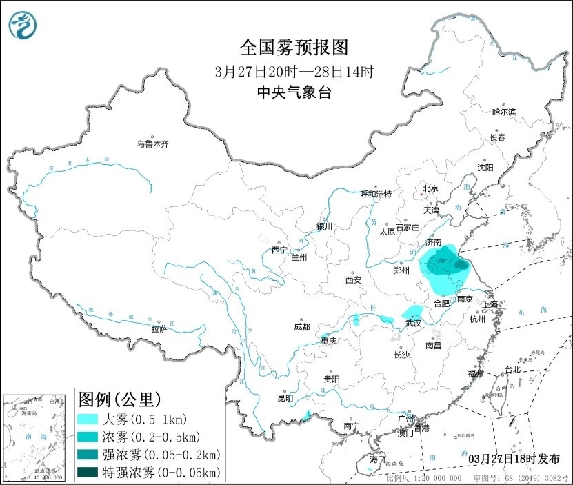 央視網(wǎng)消息:中央氣象臺(tái)3月27日18時(shí)發(fā)布大霧黃色預(yù)警:預(yù)計(jì),3月27日夜間至28日上午,山東南部、河南東部、安徽中北部、江蘇中北部、湖北東部和南部等地的部分地區(qū)有大霧,其中,山東南部、安徽北部、江蘇北部等地的部分地區(qū)有能見度低于500米的濃霧,局地有能見度低于200米的強(qiáng)濃霧。