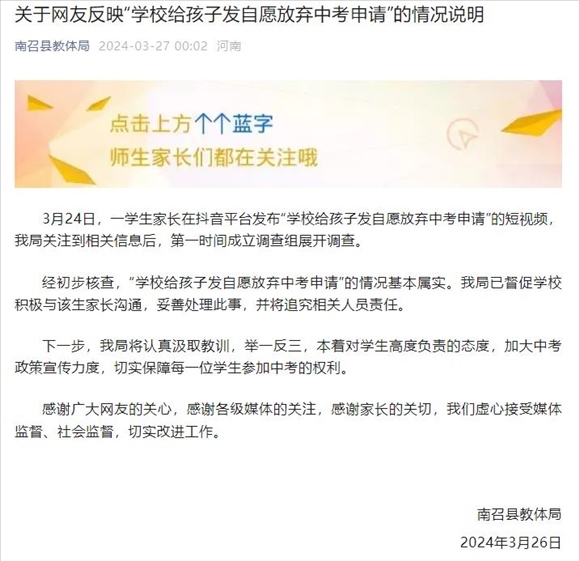 ·網(wǎng)傳河南一學校勸學生自愿放棄中考,縣教體局:基本屬實,將追責。