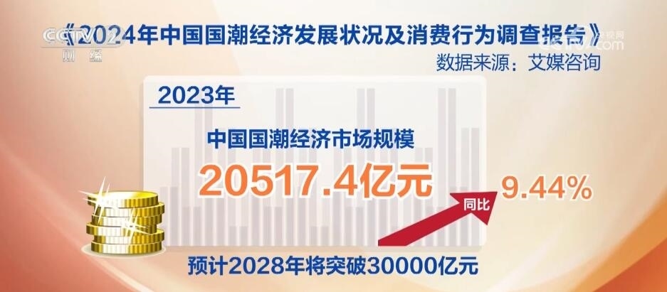 據(jù)調(diào)查,2023年中國“國潮”經(jīng)濟(jì)市場規(guī)模為20517.4億元,同比增長9.44%,預(yù)計2028年將突破30000億元。