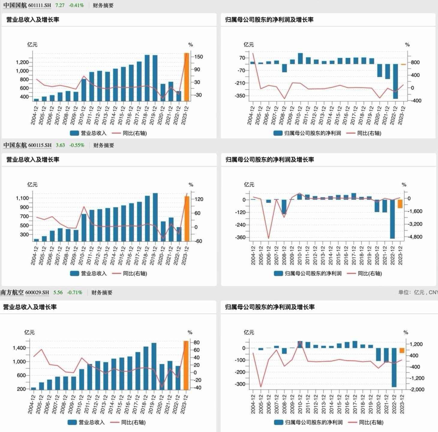總體來看,三大航2023年業(yè)績集體仍未實(shí)現(xiàn)扭虧,但整體經(jīng)營業(yè)績上有明顯改善,營收均實(shí)現(xiàn)倍增恢復(fù)。去年前三季度業(yè)績亮眼,多項(xiàng)數(shù)據(jù)創(chuàng)新很高,但去年第四季度屬于傳統(tǒng)民航客運(yùn)淡季,其間不少航線價(jià)格都會(huì)環(huán)比大幅回落。具體來看航司業(yè)績,南方航空去年?duì)I收最高,達(dá)到了1599.29億元,國航其次,營收為1411億元,東航營收為1137.41億元,分別同比增長超八成、增超1.6倍、增超1.4倍。值得注意的是,其中國航和南航去年?duì)I收已創(chuàng)歷史新高。
