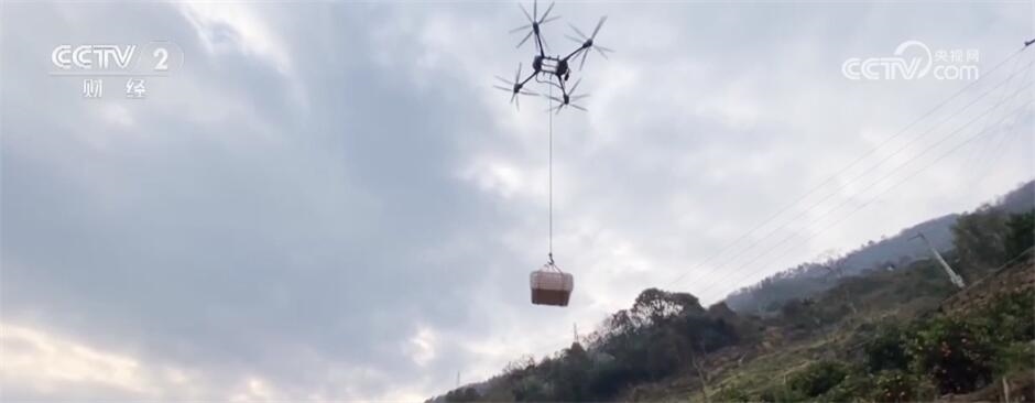 在湖北宜昌興山縣秀龍村,眼下的橙子采收也用上了新工具。裝有鉤子的無(wú)人機(jī)飛到柑橘地上空,村民用鉤子勾住裝有100斤鮮橙的筐子。隨后,無(wú)人機(jī)就將這些鮮橙運(yùn)到了公路邊的貨車(chē)上。這樣的無(wú)人機(jī)一天可以運(yùn)輸3萬(wàn)斤橙子,完成了超過(guò)16人的工作量,節(jié)約了2500元以上的成本。