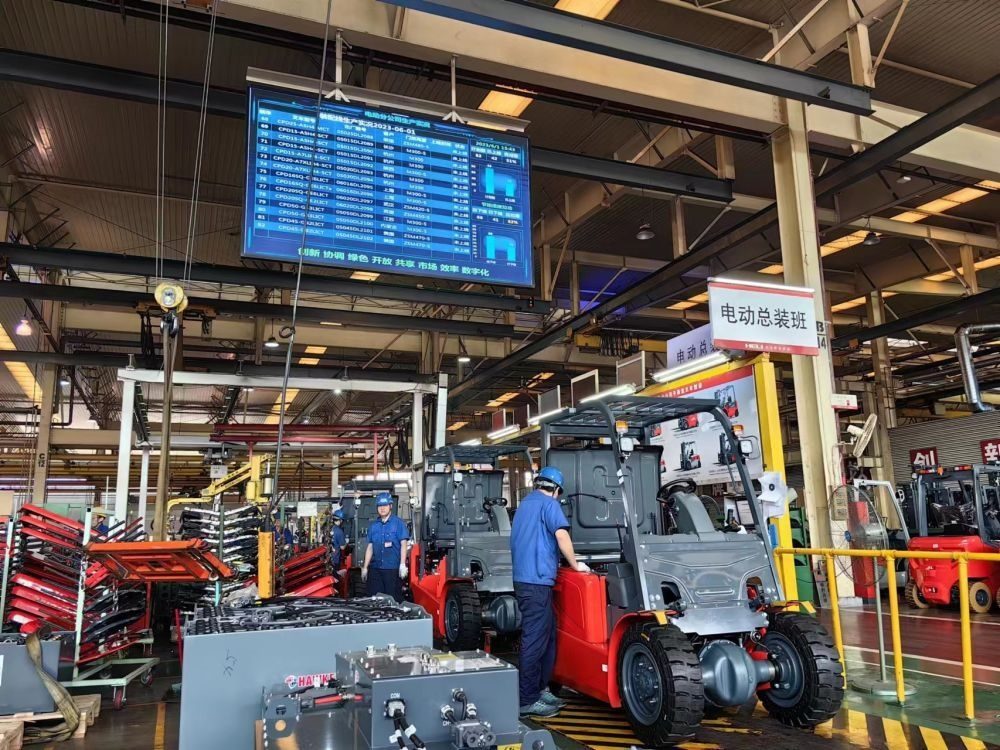 在安徽合力股份有限公司的生產(chǎn)車間,工人們在生產(chǎn)銷往RCEP成員國的叉車(2023年6月1日攝)。新華社記者 汪海月 攝