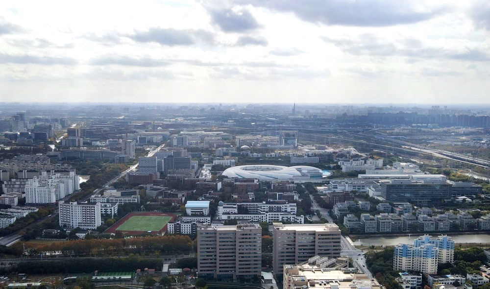 空中遠望位于上海浦東新區(qū)張江科學(xué)城的形如鸚鵡螺的大科學(xué)裝置上海光源(中)(2023年11月25日攝,無人機照片)。新華社記者 方喆 攝