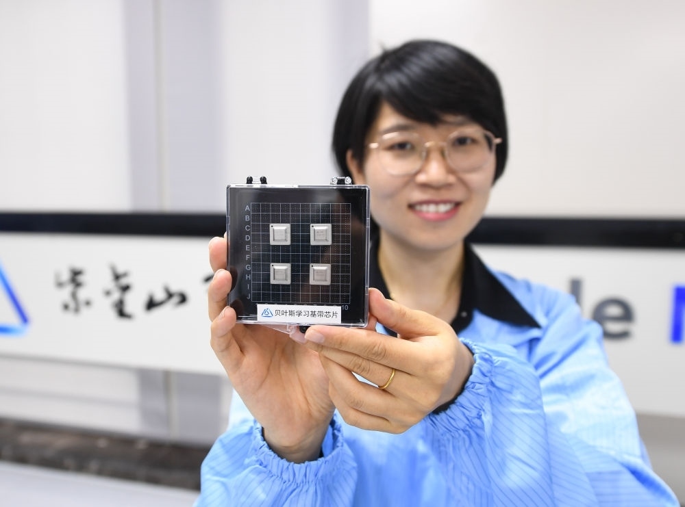 在南京紫金山實驗室6G綜合實驗室,科研人員展示自主研發(fā)的貝葉斯學(xué)習(xí)基帶芯片(2023年7月6日攝)。新華社記者 季春鵬 攝