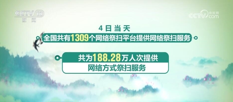 另外,4月4日當(dāng)天全國共有1309個(gè)網(wǎng)絡(luò)祭掃平臺(tái)提供網(wǎng)絡(luò)祭掃服務(wù),共為188.28萬人次提供網(wǎng)絡(luò)方式祭掃服務(wù)。