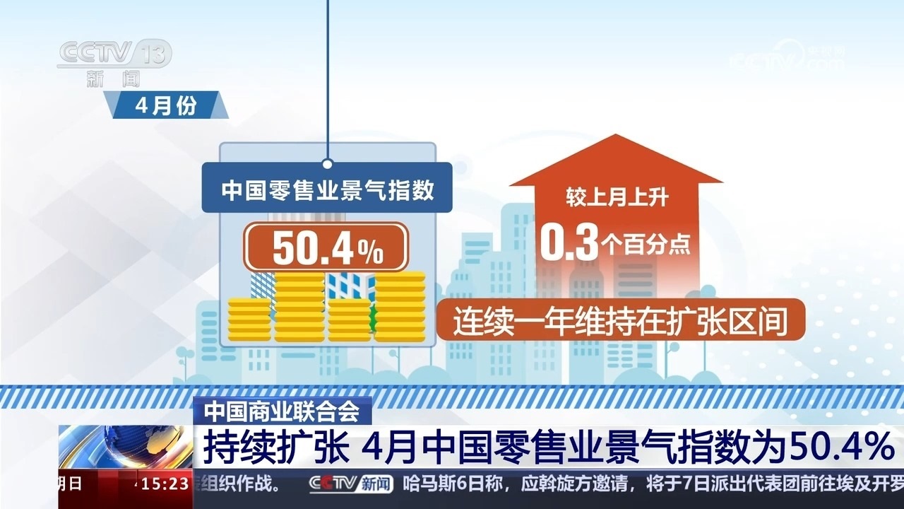 央視網消息:中國商業(yè)聯(lián)合會最新發(fā)布的中國零售業(yè)景氣指數(shù)顯示,4月份,中國零售業(yè)景氣指數(shù)為50.4%,連續(xù)一年維持在擴張區(qū)間。全國商品經營類企業(yè)對4月份盈利增長恢復的預期開始好轉。