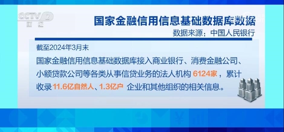 截至2024年3月末,國家金融信用信息基礎(chǔ)數(shù)據(jù)庫接入商業(yè)銀行、消費(fèi)金融公司、小額貸款公司等各類從事信貸業(yè)務(wù)的法人機(jī)構(gòu)6124家,累計(jì)收錄11.6億自然人、1.3億戶企業(yè)和其他組織的相關(guān)信息。