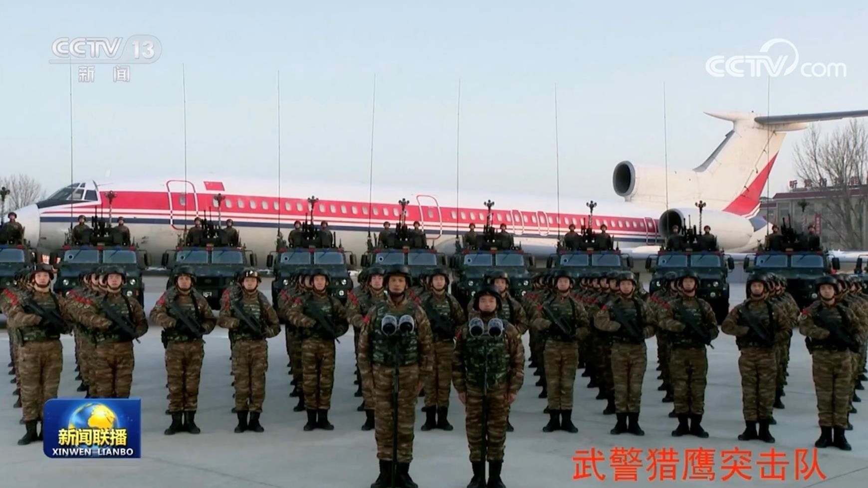 △2023年1月18日,習(xí)近平主席在北京八一大樓以視頻方式檢查部隊戰(zhàn)備工作,親切慰問有關(guān)部隊。這是武警“獵鷹突擊隊”在進行匯報。