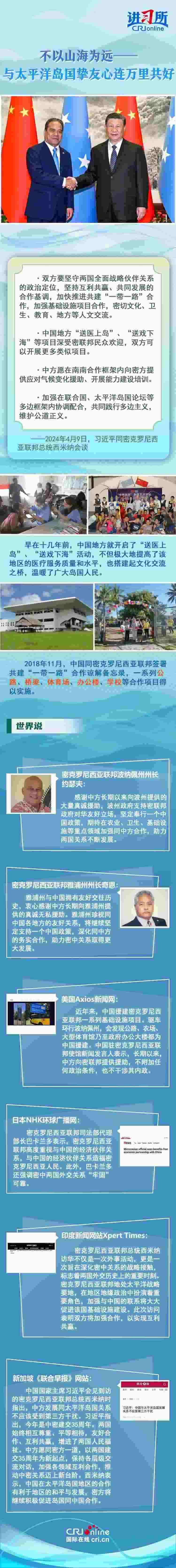 4月9日下午,中國(guó)國(guó)家主席習(xí)近平在北京同密克羅尼西亞聯(lián)邦總統(tǒng)西米納舉行會(huì)談時(shí)表示,每次見到太平洋島國(guó)的朋友,都感到很親切,中國(guó)地方“送醫(yī)上島”、“送戲下?!钡软?xiàng)目深受密聯(lián)邦民眾歡迎,中方愿繼續(xù)為島國(guó)發(fā)展提供力所能及的支持,開展三方或多方合作。
