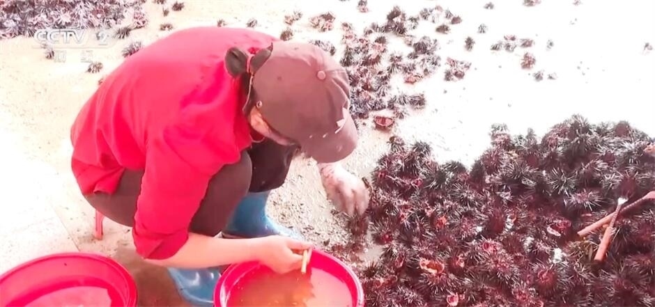 在海膽加工廠里,工人們熟練地撬開海膽殼,挖出海膽肉,用鑷子將雜質(zhì)去除,再用清水清洗干凈,一份色澤金黃、品質(zhì)新鮮的海膽肉就呈現(xiàn)在眼前了。