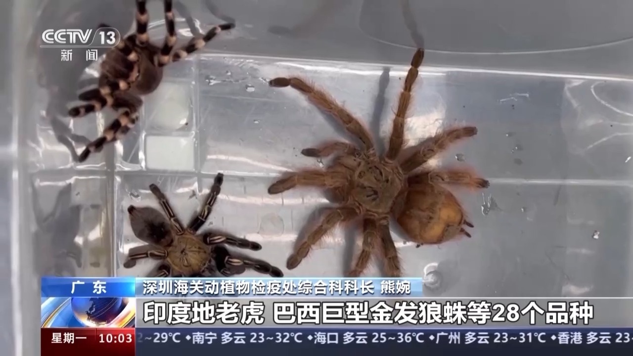 深圳海關(guān)動植物檢疫處綜合科科長 熊婉:查驗(yàn)關(guān)員在對轉(zhuǎn)運(yùn)快件開展監(jiān)管時,發(fā)現(xiàn)一票申報品名為“相機(jī)三腳架”的快件包裹機(jī)檢圖像異常,不符合相機(jī)三腳架的圖像特征,隨后進(jìn)行了開包查驗(yàn)。經(jīng)過專業(yè)機(jī)構(gòu)鑒定,這批活體蜘蛛是墨西哥金背紅尾蛛、印度地老虎、巨人偽鳴蛛、巴西巨型金發(fā)狼蛛等28個品種。