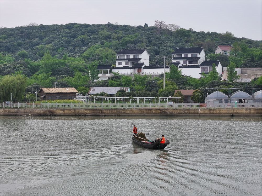 2024年4月11日,在浙江省湖州市吳興區(qū),河道保潔員在太湖沿岸清理非法捕魚地籠網(wǎng)。