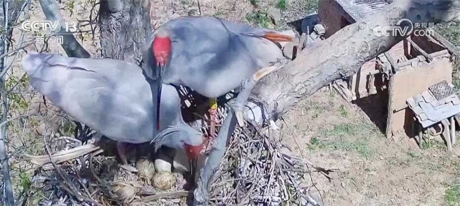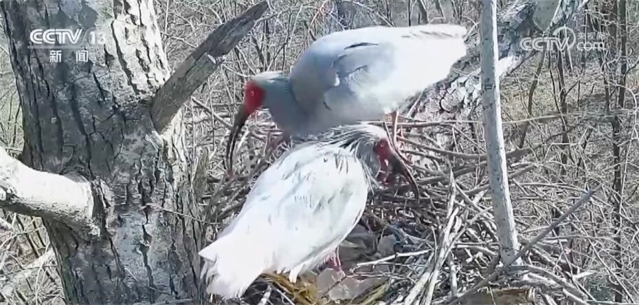 陜西銅川野生動物保護管理站的監(jiān)測畫面顯示,4月12日,一對朱鹮夫婦,一只在巢穴中臥巢,另一只則守在一旁不時整理巢穴。沒過多久,臥巢的這只朱鹮站了起來。仔細觀察,它身下的四枚卵中有一枚已經(jīng)孵化成功。