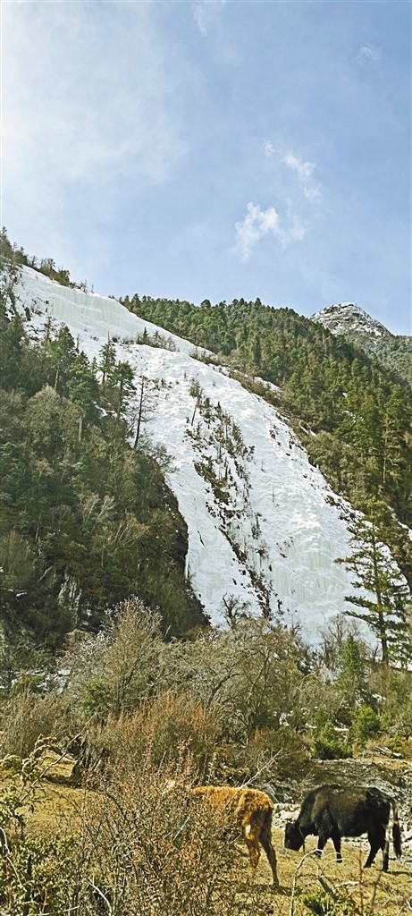 尼屋分為上尼屋和下尼屋。沿著尼屋藏布一路向上幾十公里,就來(lái)到上尼屋,夾岸兩山草木茂盛、松柏蒼翠、牛馬成群。但最讓人驚喜的是依嘎瀑布和依嘎冰川,依嘎瀑布飛瀉直下,流入尼屋藏布,依嘎冰川遠(yuǎn)看如婚紗裙擺飄灑山間,近看是明顯的冰川融化形成山體斷面。