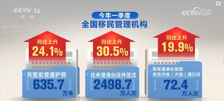 2024年一季度,全國移民管理機構(gòu)共簽發(fā)普通護照635.7萬本,往來港澳臺證件簽注2498.7萬人次,簽發(fā)港澳臺居民來往內(nèi)地(大陸)通行證72.4萬人次,同比分別上升24.1%、30.5%、19.9%。
