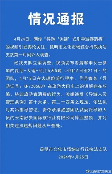 ·云南一導游“訓話”式引導游客消費?當?shù)赝▓螅簲M吊銷導游證。