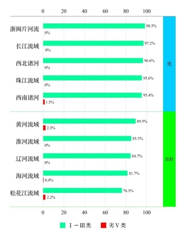 1—3月,長江、黃河、珠江、松花江、淮河、海河、遼河等七大流域及西北諸河、西南諸河和浙閩片河流水質(zhì)優(yōu)良(Ⅰ—Ⅲ類)斷面比例為91.5%,同比上升1.2個百分點(diǎn);劣Ⅴ類斷面比例為0.5%,同比上升0.1個百分點(diǎn)。主要污染指標(biāo)為化學(xué)需氧量、高錳酸鹽指數(shù)和氨氮。其中,長江流域、珠江流域、浙閩片河流、西北諸河和西南諸河水質(zhì)為優(yōu);黃河流域、松花江流域、淮河流域、海河流域和遼河流域水質(zhì)良好。