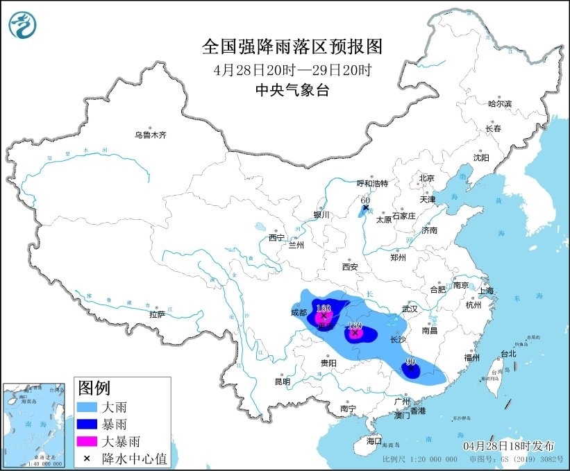 預(yù)計(jì),4月28日20時(shí)至29日20時(shí),湖北西南部、湖南大部、江西南部、四川盆地中東部、重慶大部、貴州東部、廣東北部等地部分地區(qū)有大到暴雨,其中,湖南西部、四川盆地東部、重慶東南部和西南部、貴州東北部等地部分地區(qū)有大暴雨(100~160毫米)。上述部分地區(qū)伴有短時(shí)強(qiáng)降水(最大小時(shí)降雨量30~60毫米,局地可超過(guò)80毫米),局地有雷暴大風(fēng)或冰雹等強(qiáng)對(duì)流天氣。