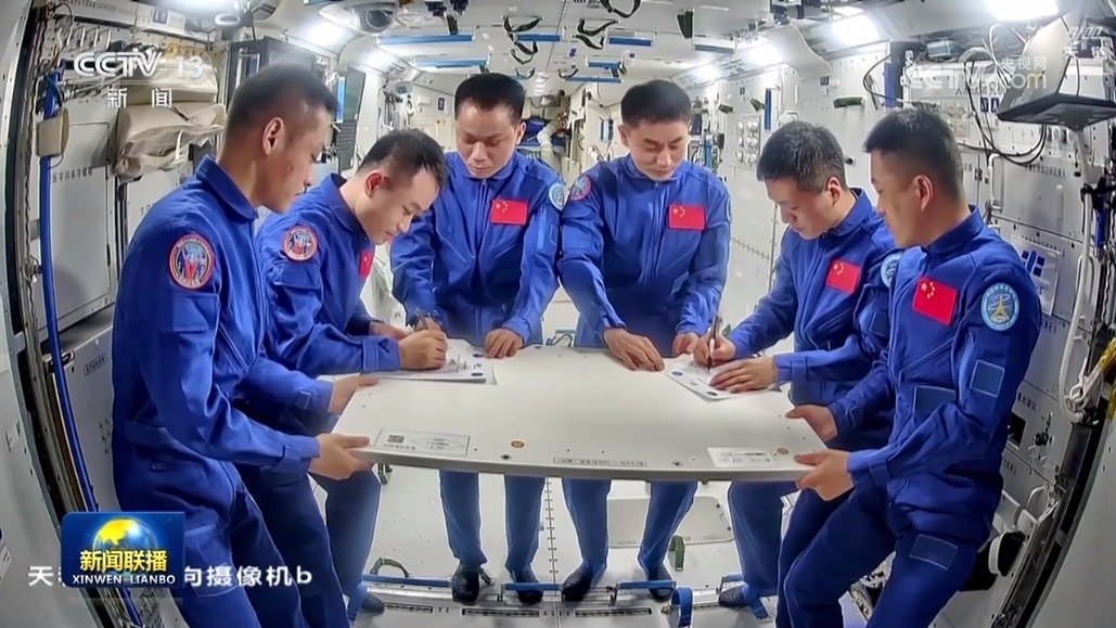 下午三時許,神舟十七號航天員湯洪波、唐勝杰、江新林和神舟十八號航天員葉光富、李聰、李廣蘇在空間站天和核心艙在軌舉行交接儀式,6名航天員分別在確認(rèn)書上簽字。