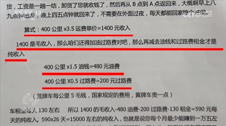 這些公司在和司機(jī)簽約時(shí),根據(jù)司機(jī)個(gè)人情況的不同,對(duì)他們收取幾千元到幾萬(wàn)元不等的費(fèi)用。還沒(méi)掙錢(qián)就先交錢(qián),而且交的還不少,司機(jī)們?yōu)槭裁磿?huì)心甘情愿地交這些錢(qián)呢?因?yàn)槊嬖嚂r(shí),公司給司機(jī)們?cè)敿?xì)算過(guò)他們的收入。