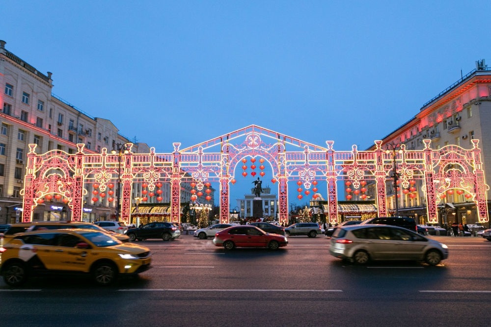 2024年2月9日,在俄羅斯首都莫斯科,車輛在中國新年主題裝飾前駛過。當(dāng)日,“莫斯科的中國新年”文化活動在俄羅斯首都莫斯科市中心啟動。新華社記者 白雪騏 攝
