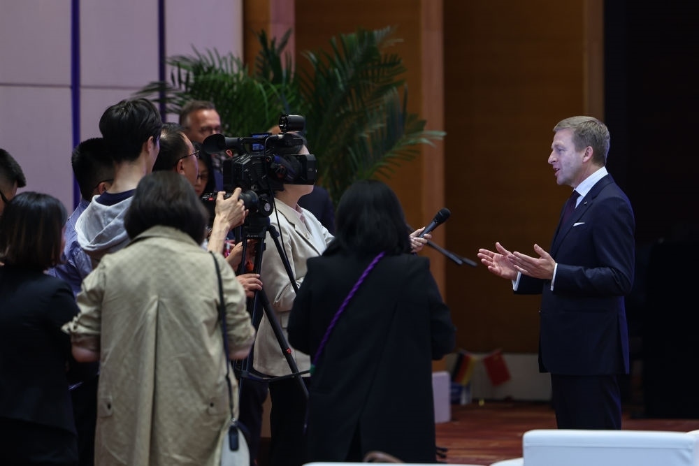 2024年4月26日,遼寧省沈陽市與寶馬集團(tuán)深化戰(zhàn)略合作簽約儀式在沈陽舉行,這是寶馬集團(tuán)董事長齊普策接受采訪。新華社記者 潘昱龍 攝