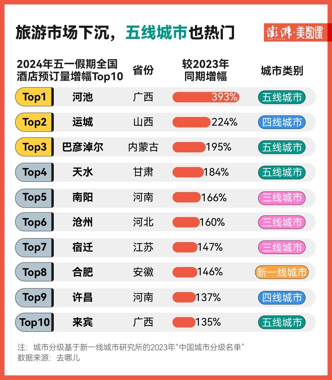 從去哪兒的數(shù)據(jù)來看,這個假期里酒店預(yù)訂量增幅前十名的城市幾乎都是三線、四線或五線城市,其中五線城市河池以393%的同比增幅領(lǐng)跑全國,其次是山西運城、內(nèi)蒙古巴彥淖爾。