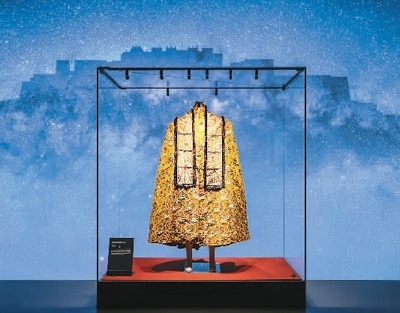 走進(jìn)展廳,在星空璀璨的布達(dá)拉宮夜景映襯下,一件金燦燦的斗篷格外引人注目。斗篷是西藏地區(qū)常見的服裝,根據(jù)場(chǎng)合和穿著對(duì)象的不同,斗篷的式樣和用料均有所差別。這件金寶地花卉紋斗篷通長(zhǎng)170厘米,黃綢緞上繡滿了花紋圖案,并鑲有多種珠寶,衣領(lǐng)上縫有獺皮,背后繡有云龍紋,可想而知穿著者身份之顯赫。此次展覽是它首次公開展出。