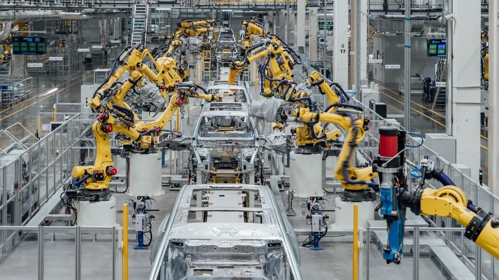 這是在重慶市兩江新區(qū)拍攝的賽力斯汽車超級工廠焊裝車間生產(chǎn)線(2024年2月26日攝,無人機(jī)照片) 新華社發(fā)(高彰 攝)。