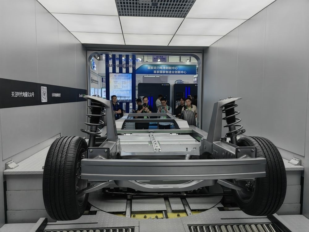 這是在四川省宜賓市舉行的2023世界動力電池大會上展示的新能源汽車換電系統(tǒng)(2023年6月9日攝)。新華社記者 胡旭 攝