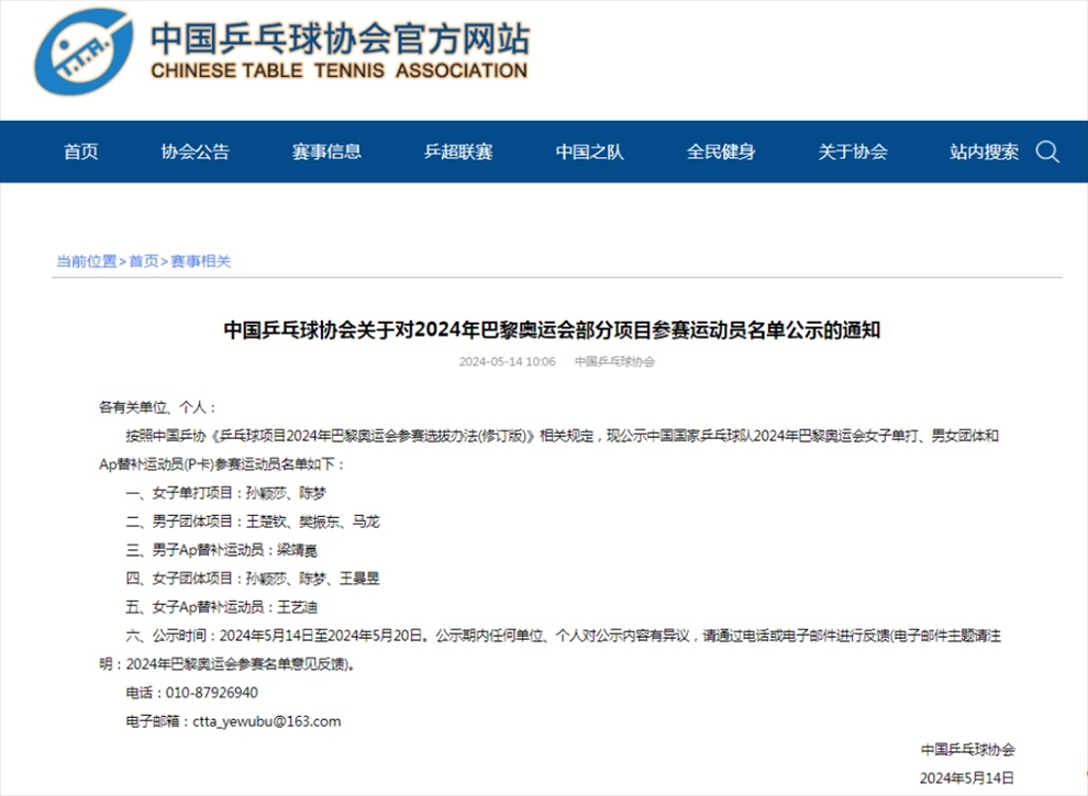 ·中國乒協(xié)公示巴黎奧運(yùn)會女單、男女團(tuán)參賽運(yùn)動員名單。