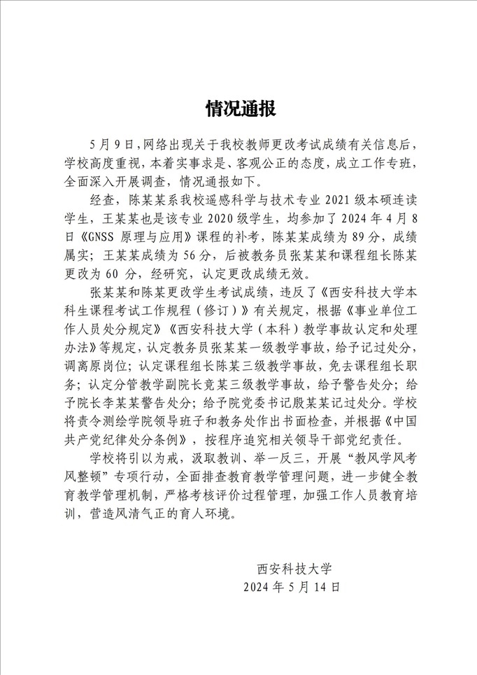 ·學(xué)生成績按“鬧”修改?西安科大通報:更改成績無效,多人被處分。