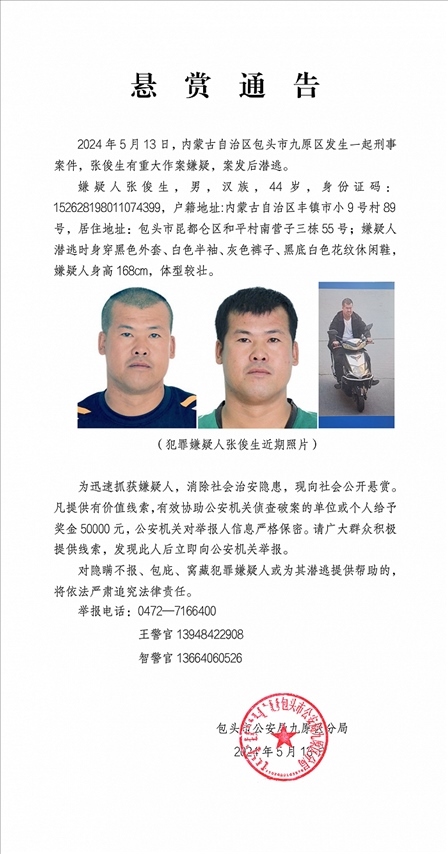 ·內(nèi)蒙古包頭發(fā)生一起刑事案件,警方懸賞5萬緝兇。
