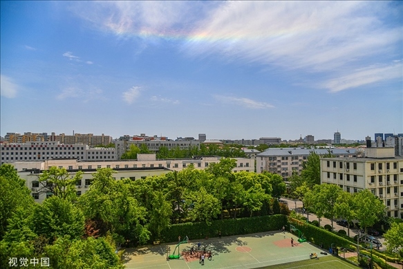 5月14日中午,北京南方天空出現(xiàn)罕見的環(huán)地平弧天象,彩虹一般的七彩祥云下市民正在球場上運(yùn)動。