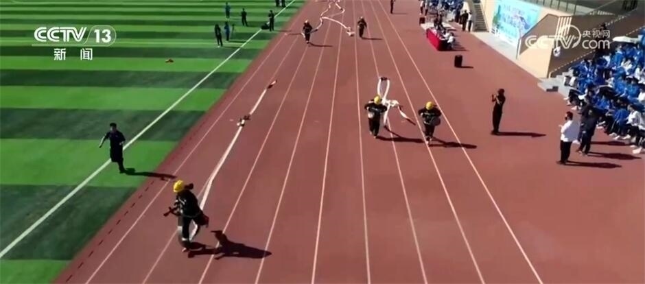 發(fā)令員一聲哨響,幾名消防員手持水槍水帶,飛快向前沖出。這是在山東濟寧某中學舉行的首屆“消防安全運動會”上,消防員模擬救援現場進行的四百米五帶三槍操法展示。