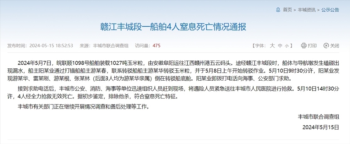 ·江西豐城4人轉運受潮玉米時身亡,官方通報:因窒息死亡,排除他殺。
