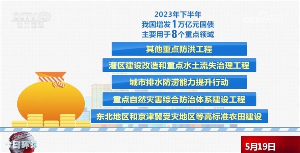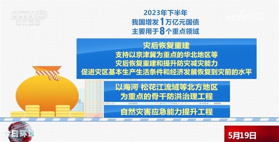 去年下半年,我國增發(fā)了1萬億元國債,主要用于8個重點領(lǐng)域,包括災(zāi)后恢復(fù)重建,支持以京津冀為重點的華北地區(qū)等災(zāi)后恢復(fù)重建和提升防災(zāi)減災(zāi)能力,促進災(zāi)區(qū)基本生產(chǎn)生活條件和經(jīng)濟發(fā)展恢復(fù)到災(zāi)前的水平,以海河、松花江流域等北方地區(qū)為重點的骨干防洪治理工程,自然災(zāi)害應(yīng)急能力提升工程,其他重點防洪工程,灌區(qū)建設(shè)改造和重點水土流失治理工程,城市排水防澇能力提升行動,重點自然災(zāi)害綜合防治體系建設(shè)工程,東北地區(qū)和京津冀受災(zāi)地區(qū)等高標準農(nóng)田建設(shè)。