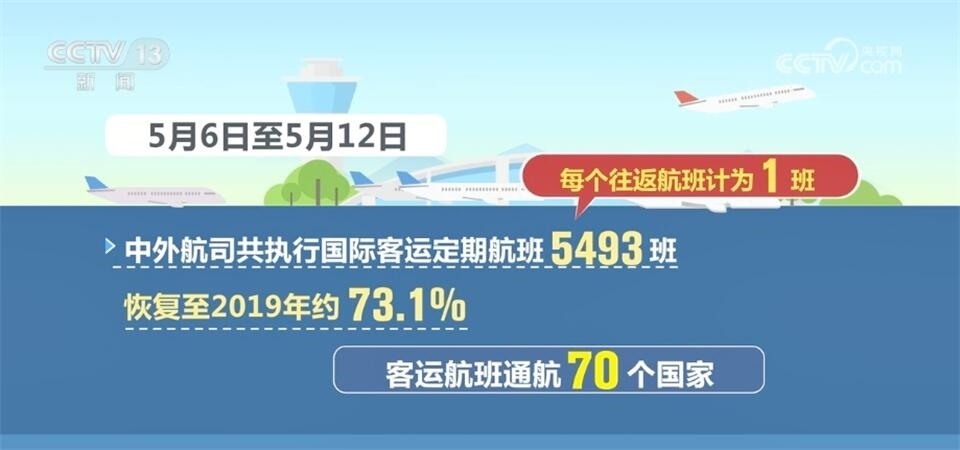 中國民航局?jǐn)?shù)據(jù)顯示,5月6日至5月12日,中外航司共執(zhí)行國際客運定期航班5493班(每個往返航班計為1班),恢復(fù)至2019年約73.1%,客運航班通航70個國家。