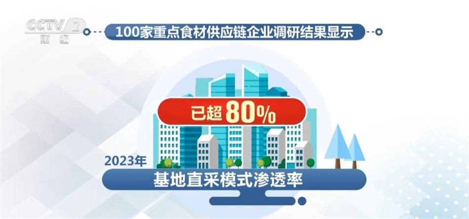 我國食材供應(yīng)鏈企業(yè)鏈條逐漸向上游延伸。100家重點(diǎn)食材供應(yīng)鏈企業(yè)調(diào)研結(jié)果顯示,2023年基地直采模式滲透率已超80%,有效縮短供應(yīng)鏈鏈條,降低食材采購和流通成本。