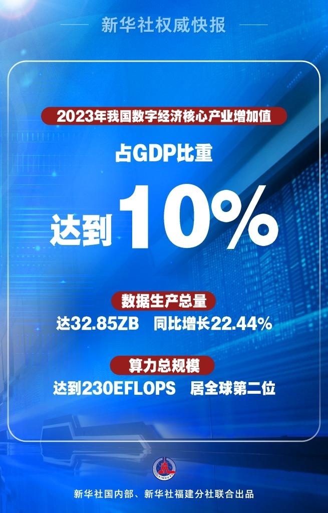 2023年我國數(shù)字經濟保持穩(wěn)健增長,數(shù)字經濟核心產業(yè)增加值占GDP比重達到10%。數(shù)據(jù)要素市場日趨活躍,2023年數(shù)據(jù)生產總量達32.85ZB(1個ZB等于十萬億億字節(jié)),同比增長22.44%。數(shù)字基礎設施不斷擴容提速,算力總規(guī)模達到230EFLOPS(EFLOPS是指每秒百億億次浮點運算次數(shù)),居全球第二位。