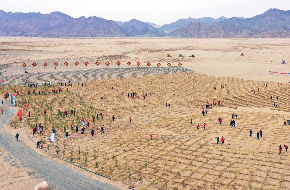 阿拉善盟位于內(nèi)蒙古最西部,盤踞在此的騰格里沙漠、巴丹吉林沙漠、烏蘭布和沙漠有連片之憂。阿拉善盟林草局局長圖布新說,一開春,阿拉善盟即全面啟動規(guī)劃治沙總面積達(dá)621.3萬畝的內(nèi)蒙古西部荒漠綜合治理項(xiàng)目(二期),目前已有168個(gè)作業(yè)區(qū)開工,累計(jì)完成治沙面積340余萬畝。